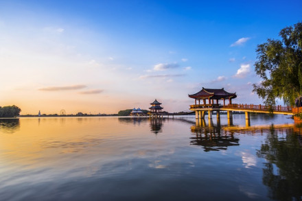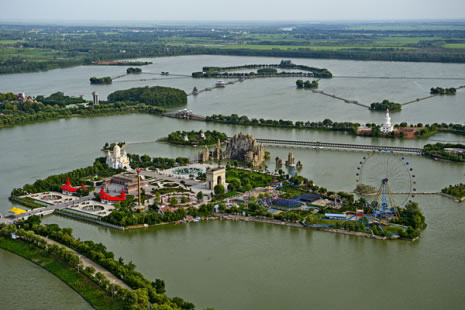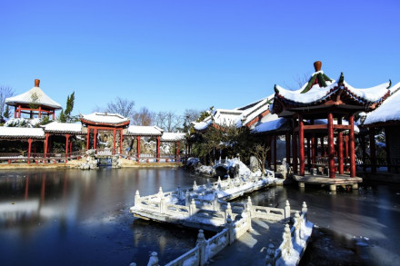 五冠橋位于旅游區(qū)主景觀帶的環(huán)湖路景觀帶上,它是根據(jù)揚州瘦西湖五亭橋所建,因橋上建有五個亭子,便被稱為“五亭橋”。景區(qū)內(nèi)的五亭橋把五個亭子改成了形狀如冠的形狀,其余均同五亭橋,所以又名“五冠橋”。
