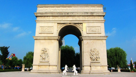 凱旋門是為了紀(jì)念拿破侖一世在1805年12月2日的一次戰(zhàn)役中大敗奧俄聯(lián)軍的勝利而建的。在1806年2月12日,根據(jù)拿破侖一世親自批準(zhǔn)的計劃,按照著名設(shè)計師戛爾格蘭的設(shè)計圖紙施工,歷時30年,于1836年7月29日竣工。八里河風(fēng)景區(qū)的雄獅凱旋門是按原建筑的1/3縮小。