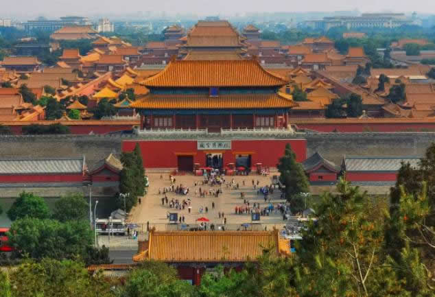 故宮宮城周圍環(huán)繞著高12米,長3400米的宮墻,形式為一長方形城池,墻外有52米寬的護(hù)城河環(huán)繞,形成一個森嚴(yán)壁壘的城堡。故宮有4個門,正門名午門,東門名東華門,西門名西華門,北門名神武門。面對北門神武門,有用土、石筑成的景山。在整體布局上,景山可說是故宮建筑群的屏障。