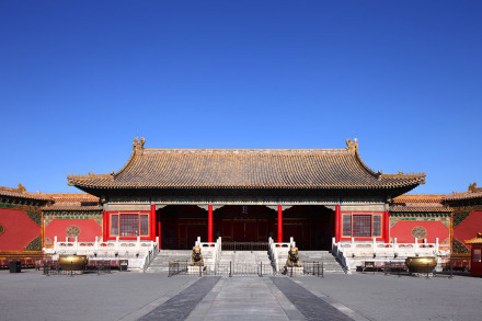 交泰殿為內(nèi)廷后三宮之一,位于乾清宮和坤寧宮之間,約為明嘉靖年間建。交泰殿平面為方形,深、廣各3間。明間設(shè)寶座,上懸康熙帝御書“無為”匾,寶座后有板屏一面,上書乾隆帝御制《交泰殿銘》。交泰殿為皇后千秋節(jié)受慶賀禮的地方。清代于此殿貯清二十五寶璽。每年正月,由欽天監(jiān)選擇吉日吉時,設(shè)案開封陳寶,皇帝來此拈香行禮。清世祖所立“內(nèi)宮不許干預(yù)政事”的鐵牌曾立于此殿;实鄞蠡闀r,皇后的冊、寶安設(shè)殿內(nèi)左右案上。每年春季祀先蠶,皇后先一日在此查閱采桑的用具。