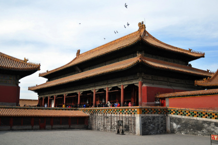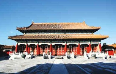 中和殿位于太和殿后,高27米,平面呈正方形,面闊、進(jìn)深各為3間,四面出廊,建筑面積580平方米。黃琉璃瓦單檐四角攢尖頂,正中有鎏金寶頂。中和殿是皇帝去太和殿舉行大典前稍事休息和演習(xí)禮儀的地方。皇帝在去太和殿之前先在此稍作停留,接受內(nèi)閣大臣和禮部官員行禮,然后進(jìn)太和殿舉行儀式。另外,皇帝祭祀天地和太廟之前,也要先在這里審閱一下寫有祭文的“祝版”;在到中南海演耕前,也要在這里審視一下耕具。