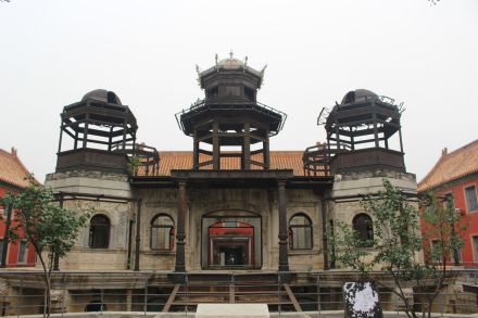 延禧宮為內(nèi)廷東六宮之一,建于明永樂十八年(1420年),初名長壽宮。殿前有東西配殿各3間。后院正殿5間,亦有東西配殿各3間,均為黃琉璃瓦硬山頂。宣統(tǒng)元年(1909年)在延禧宮原址興工修建一座3層西洋式建筑——水殿。水殿四周浚池,引玉泉山水環(huán)繞。主樓每層9間,底層四面當(dāng)中各開一門,四周環(huán)以圍廊。隆裕太后題匾額曰“靈沼軒”,俗稱“水晶宮”。1917年張勛復(fù)辟時,延禧宮北部被直系部隊飛機(jī)投彈炸毀。