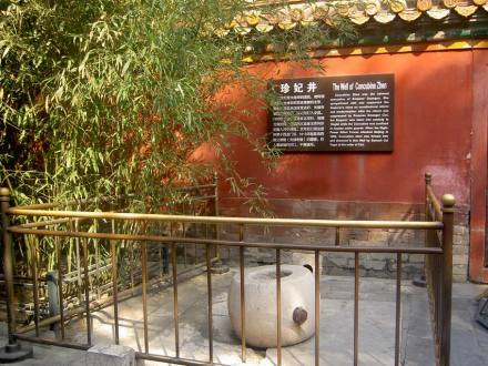 位于北京故宮寧壽宮北端的貞順門內(nèi),原為宮中普通水井。珍妃井井眼上置井口石,石兩側(cè)鑿小洞,用以穿入鐵棍上鎖。清光緒二十六年(1900年)八國聯(lián)軍攻打京城,慈禧太后與光緒皇帝倉惶西逃。臨行之前,慈禧太后將幽禁在景祺閣北小院的珍妃召至頤和軒,命太監(jiān)崔玉貴等人將她推入貞順門內(nèi)井中溺死,此井因而得名“珍妃井”。