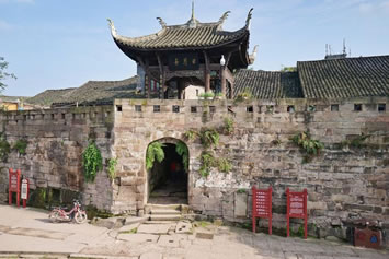 日月門:系大榮寨的四大城門之北門,門樓上有日月亭,門內(nèi)即煙雨巷,“橋橫古渡煙霞聚,寨聳雄關(guān)日月巡”。門內(nèi)有一甕形古井,深12.2米,內(nèi)設(shè)暗道通往河心,由重一噸多的石板遮蓋。該井系嘉慶年間修建的戰(zhàn)備設(shè)施,以備遭兵匪長期圍困時取水傳信之用。