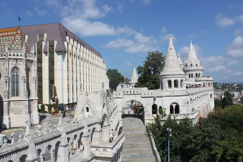 漁人堡 漁人堡(Halászbástya)是一個(gè)新哥特式和新羅曼風(fēng)格的觀景臺(tái),位于匈牙利首都布達(dá)佩斯布達(dá)一側(cè)多瑙河河畔的城堡山,鄰近馬加什教堂。它修建于1895年到1902年之間,設(shè)計(jì)師是弗里杰·舒勒克(Frigyes Schulek)。第二次世界大戰(zhàn)期間,漁人堡近乎毀滅。1947年至1948年之間,弗里杰·舒勒克的兒子亞諾什·舒勒克負(fù)責(zé)了修復(fù)工程。 如今,城堡的一部分作為餐廳使用。回廊里有絕佳的觀景角度,而瑪加什教堂與漁人城堡間的銅像,則是第一位匈牙利國圣·伊斯特萬一世,圣·史迪分國王雕像(King St. Stephen’s statue)圣·史迪分國王是匈牙利第一個(gè)天主教國王(公元1000年加冕),同時(shí)也可以說是匈牙利國的建立者。漁人堡旁的希爾頓旅館,外層是茶色的帷幕玻璃映照著漁人堡和一旁的教堂倒影,美麗而迷人。 從塔和觀景臺(tái),可以看到多瑙河、瑪格麗特島、東面的佩斯,以及蓋勒特丘陵(Gellért Hill)的全景。