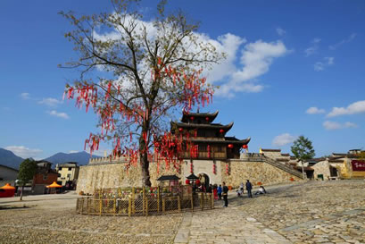 和平古鎮(zhèn)現(xiàn)存東北兩座譙樓。東門(mén)譙樓是三重檐歇山式,而其他三座譙均是兩重檐的。東門(mén)譙樓,門(mén)洞用石條砌成,墻體用大塊的卵石筑成。城墻腳下的這塊“禁止搬運(yùn)、保固地方”的石頭,是和平“舊市三禁碑”之一,為清代設(shè)立。由于當(dāng)時(shí)社會(huì)地主少、農(nóng)民多,農(nóng)民每次把收成的大部分上交給地主,在青黃不接的時(shí)候,糧價(jià)上漲,地主就把大部分的糧食外運(yùn)到邵武城關(guān)或福州,造成產(chǎn)糧地變?yōu)槿奔Z地,農(nóng)民面臨饑餓的威脅,因而設(shè)此碑,并輪流放哨,規(guī)定所有私自外運(yùn)的糧食都必須沒(méi)收或低價(jià)收購(gòu),因而它起到維護(hù)當(dāng)時(shí)的糧食市場(chǎng)的作用。北門(mén)譙樓,當(dāng)?shù)厝朔Q(chēng)“武陽(yáng)樓”,因它對(duì)面的山叫武陽(yáng)山,清同治年間翻修過(guò)。城門(mén)的門(mén)洞用條石砌成,比東門(mén)門(mén)洞高大。城門(mén)兩邊各保留了一段用鵝卵石筑成的明城墻,鵝卵石上長(zhǎng)滿青苔,漫漶的縫隙間長(zhǎng)著青青野草,四季皆有野花開(kāi)放,充滿了詩(shī)情畫(huà)意。風(fēng)雨譙樓,見(jiàn)證百年夕陽(yáng)煙雨;古樸城門(mén),迎送多少古鎮(zhèn)喜憂。譙樓走過(guò)的是悠悠歲月,形容雖然殘破斑駁,留下的卻是耐人尋味的古鎮(zhèn)歷史。