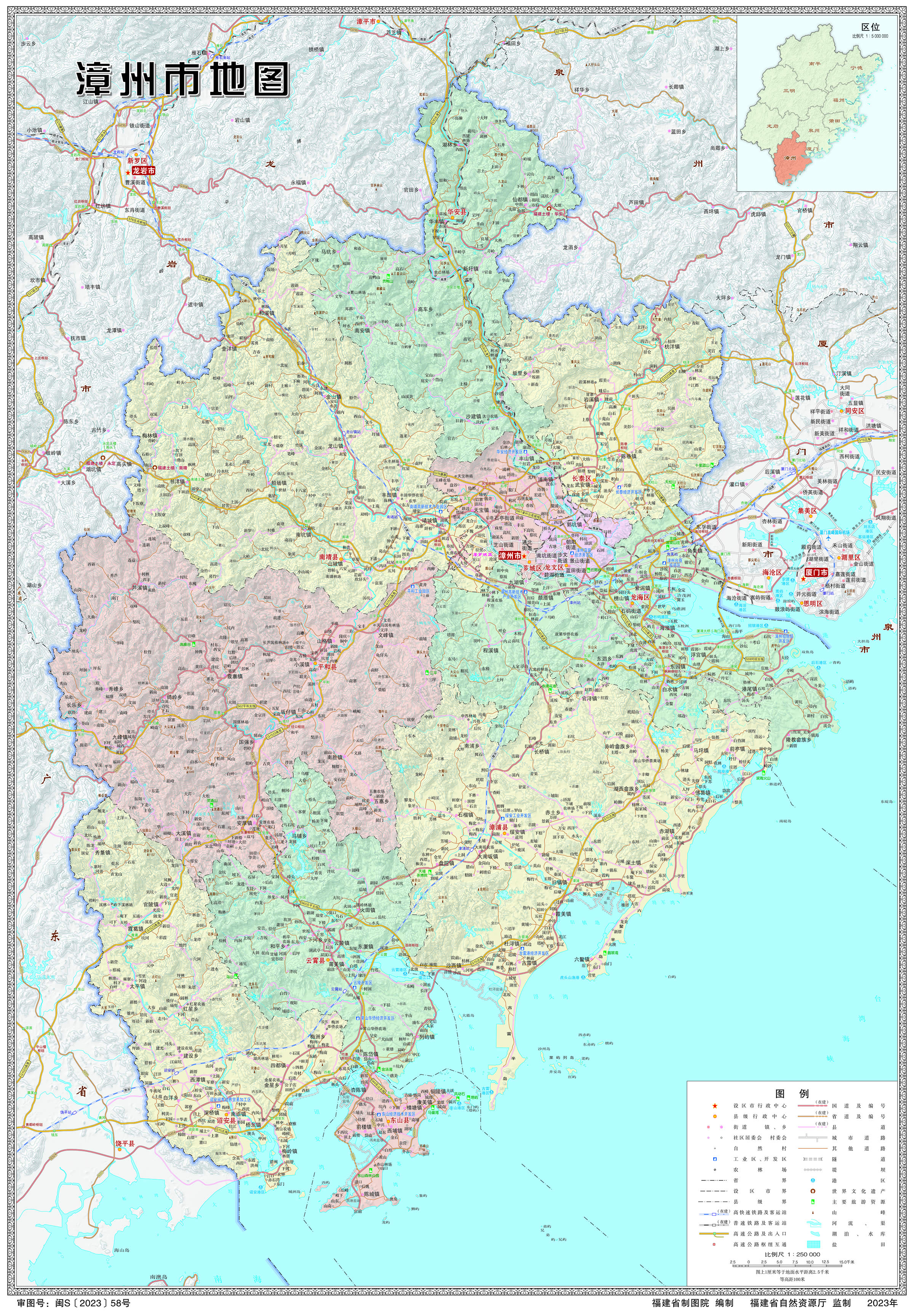 漳州市位于福建省南部,東鄰廈門市集美區(qū),東北與廈門市同安區(qū)、泉州市安溪縣接壤,北與龍巖市漳平、永定等市縣毗連,西與廣東省梅州市大埔、潮州市饒平縣交界,東南與臺灣省隔海相望。漳州市陸域南北長187千米,東西寬127千米,面積1.26萬平方千米。擁有海岸線715千米、島嶼143個,海域面積1.86萬平方千米。