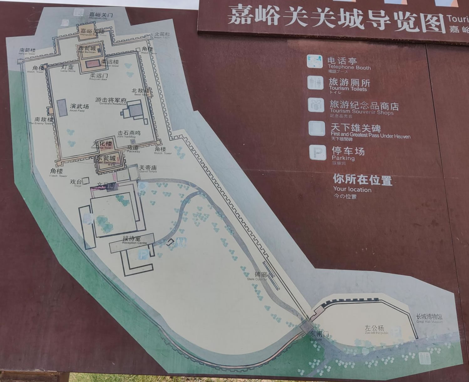 嘉峪關(guān)由內(nèi)城、外城、城壕三道防線成重疊并守之勢,壁壘森嚴(yán)。與長城連為一體,形成五里一燧,十里一墩,三十里一堡,一百里一城的軍事防御體系。嘉峪關(guān)初建時(shí),是一座6米高的土城,占地2500平方米,F(xiàn)存的關(guān)城總面積33500余平方米,由外城、內(nèi)城和甕城組合而成。嘉峪關(guān)內(nèi)城墻上建有箭樓、敵樓、角樓、閣樓、閘門等共十四座,關(guān)城內(nèi)建有游擊將軍府、井亭、文昌閣,東門外建有關(guān)帝廟、牌樓、戲樓等。