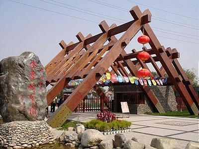 蘭州水車博覽園的南大門(正門)是一個(gè)造形獨(dú)特的木架結(jié)構(gòu)的大門,它寓意著兩個(gè)意思: