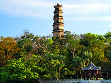 泗洲塔位于廣東惠州西湖西山,是湖上最古老建筑物。始建于唐中宗年間,為紀念泗洲大圣僧伽而筑,北宋文學家蘇軾謫居惠州時稱之為大圣塔。明嘉靖四十三年(1564年)塔毀,明萬歷初年改建亭,明萬歷四十六年(1618年)復建塔。光緒初年,雷破塔頂一角,長了一株榕樹,清代愛國詩人丘逢甲詩云:“行人欲問朝云墓,看取亭亭塔頂榕”。山上綠樹成蔭,亭廊排映,景色秀麗。蘇東坡寫的《江月五首》“一更山吐月,玉塔臥微瀾”的著名詩句指的正是此塔。泗洲塔明代后建至今,已有整整403年古老歷史,是惠州現(xiàn)保存最完善古老的珍貴建筑物之一;葜葶糁匏粡V東省人民政府批準并公布為第八批廣東省文物保護單位。