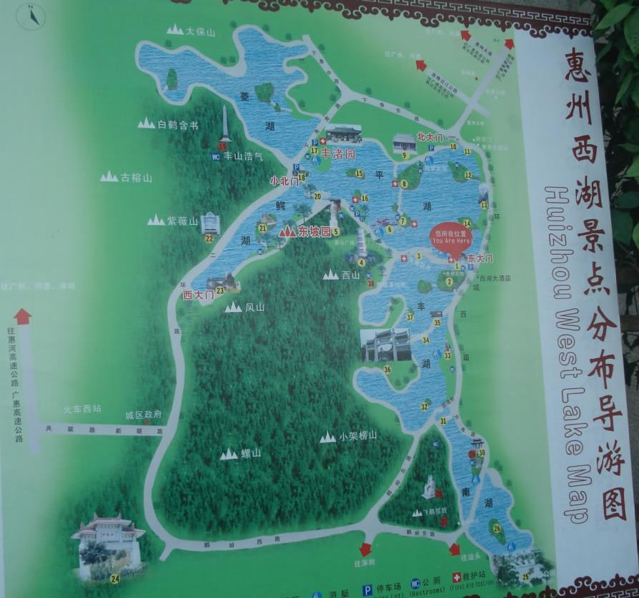 其山川秀邃、幽勝曲折、浮洲四起、青山似黛,古色古香的亭臺樓閣隱現(xiàn)于樹木蔥蘢之中,景域妙在天成,有“苧蘿西子”、“嶺南明珠”之美譽,并有“大中國西湖三十六,唯惠州足并杭州” 的史載。歷代以蘇東坡、李商隱、楊萬里、祝枝山、陳堯佐、白玉蟾、梁鼎芬、丘逢甲為代表的400多位文人墨客曾踏足惠州,為西湖留下了寶貴的文化遺產(chǎn);近代孫中山、周恩來等領導人在惠州從事過革命運動,在西湖留下了光輝的足跡。這些歷史古跡和革命勝跡與西湖的青山秀水融為一體,相得益彰。