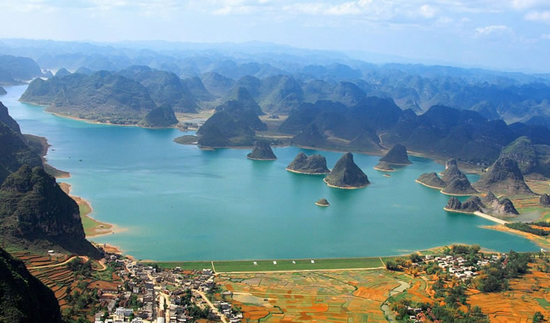 渠洋湖,是一個大型的喀斯特高原湖泊水庫。庫區(qū)總容量9228平方米,水質優(yōu)良,有大小島嶼十多個,沿岸有海拔一千多米的岜行山,以及掩映在綠樹翠竹當中的幾百個壯族干欄式村寨。