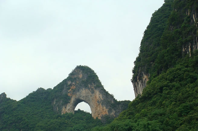 月亮山位于位于廣西壯族自治區(qū)桂林市陽朔縣十里畫廊景區(qū)末端。山頭上有一個天然的大石拱,兩面貫通,遠看酷似天上明月高掛。從不同的角度變換觀看,此洞形狀也不斷變化。如果是開著車賞月山,那個石拱的形狀會從彎彎的上弦月,逐漸變成半月、圓月,繼而又變成下弦月。