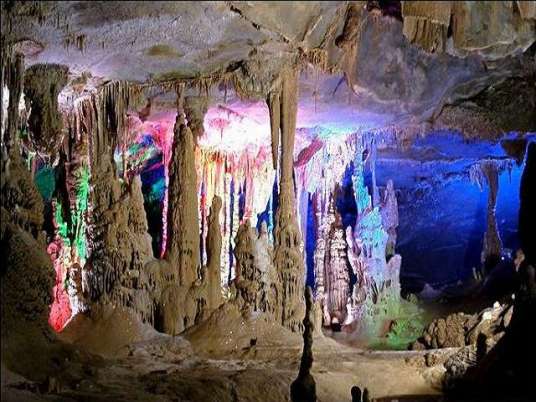 此洞分為4個大殿堂,輝煌瑰麗,多姿多彩,讓人看了留連忘返。其中最為壯觀的是那個100多米高,幾百米寬、1000多米長的大殿堂內,幾十個70~80米高、3~5米直徑的鐘乳石柱,構成龐大的石塔群,挺拔高聳,雄偉壯麗,讓人驚嘆不已。加上洞中霧氣繚繞,變幻無窮,更使這個巍巍景觀顯得詭秘多姿。這些巨大的鐘乳石塔,是經(jīng)過幾億年巖溶發(fā)育的結晶,其中最大的石筍需十人方能合圍,最高的石柱達39米,實屬“天下之最”。