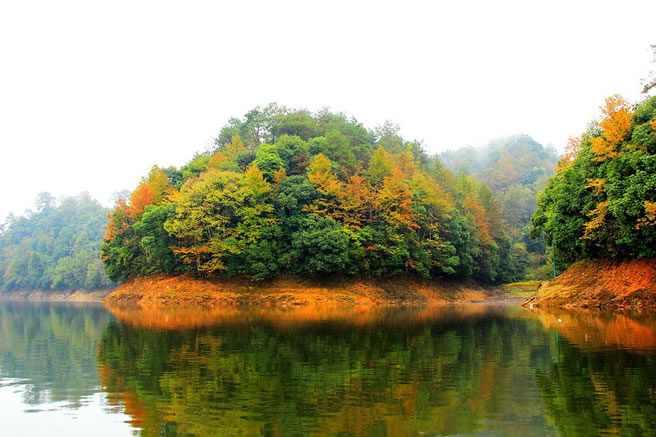 鴛鴦湖,位于縣城東部約1.5千米的鳳凰山腳下,是兩口并排、相隔30多米的大水潭。右潭水清澈如鏡,水中游魚歷歷可數(shù);左潭水色渾濁,略呈黃色。當?shù)厝嚎偡Q水色清澈的右潭為母塘,水色渾濁的左潭為公潭,俗稱“公母塘”。兩塘的水均從鳳凰山腳下涌出。