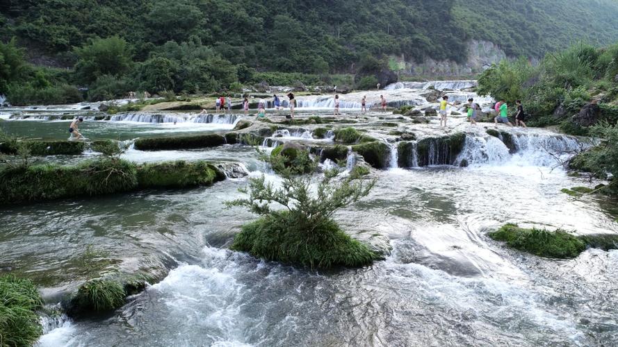 響水瀑布洛江灘頭,河水奔流而下,其聲隆隆,遠(yuǎn)聞若雷,近聞似鼓,四季如此,故此得名“響水”。此響水灘為典型的喀斯特地貌,水流呈階梯狀分布,在地質(zhì)學(xué)上稱為邊石壩,所含成份多為鈣化石。可與九寨溝五彩池比美。