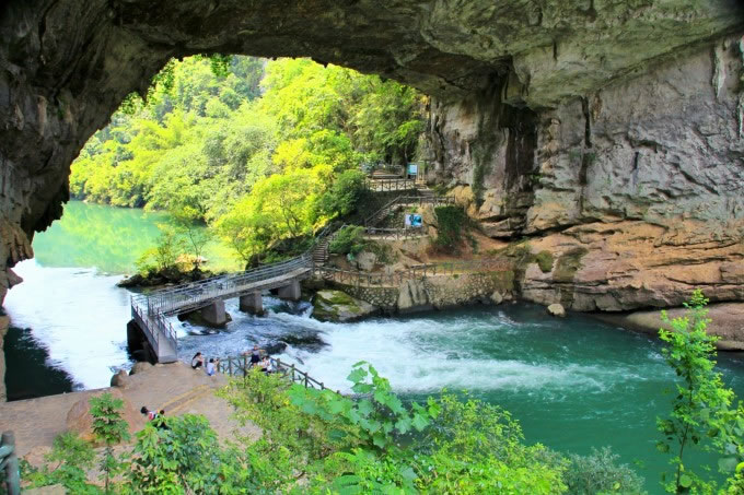 天生橋橋洞拱高35米,橋面長(zhǎng)寬度各40米。這里有一個(gè)美麗動(dòng)人的傳說(shuō),以前這里沒(méi)有橋,過(guò)河極為不便,遠(yuǎn)在洛陽(yáng)的魯班師傅知道后,揮動(dòng)他手中的板斧一揮而就,當(dāng)?shù)氐睦习傩諡楦兄x他,就送了三顆香桃給他,當(dāng)時(shí)正值陽(yáng)春三月,桃紅柳綠,魯班師傅就把此橋稱之為“香橋”。