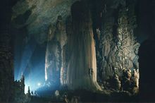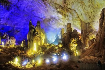積七萬多平方米,最寬處達一百七十五米,最高處一百五墕主。洞內地勢起伏,石峰叢立,如重巒疊嶂,山間常有云霧繚繞。有金色塔山、成林玉樹,還有螺旋狀的高大石柱“螺旋樹”。