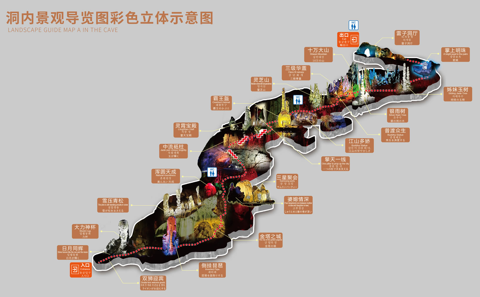 遠古時洞頂塌落的巨石堆積如山,稱“萬壽山”。后來山上又覆滿巖溶堆積物。上有珍奇的“穴罐”,呈橢圓形。旁有“雞血石”,晶瑩緋紅,酷似“孔雀開屏”。有三尊“壽星”,高十至二十米。洞頂和廳壁由黃、白、紅、藍、褐諸色構成美麗的圖案。