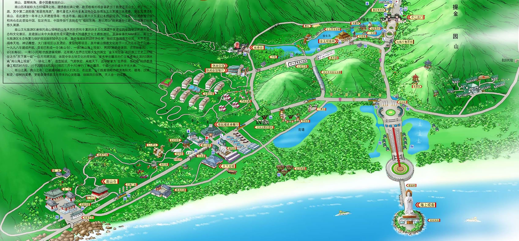 三亞南山風(fēng)景區(qū)是國家旅游局確定的“中國旅游業(yè)發(fā)展優(yōu)先項(xiàng)目”。它位于中國唯一的熱帶濱海城市三亞市的西部,是全國罕見的超大型文化和生態(tài)旅游園區(qū)。園區(qū)規(guī)劃面積五十平方公里,其中海域面積十多平方公里,由美國紐約國際城市設(shè)計(jì)公司統(tǒng)籌規(guī)劃,美國經(jīng)濟(jì)咨詢聯(lián)合公司提供可行性報(bào)告。項(xiàng)目內(nèi)容策劃分別由中國佛教文化研究所、中國民俗學(xué)會(huì)、中國歷史博物館、中央民族大學(xué)、中國環(huán)境科學(xué)院、中國科學(xué)院生態(tài)中心完成。該項(xiàng)目是海南省的重點(diǎn)建設(shè)項(xiàng)目,同時(shí)被三亞南山風(fēng)景區(qū)是國家旅游局確定的“中國旅游業(yè)發(fā)展優(yōu)先項(xiàng)目”。它位于中國唯一的熱帶濱海城市三亞市的西部,是全國罕見的超大型文化和生態(tài)旅游園區(qū)。園區(qū)規(guī)劃面積五十平方公里,其中海域面積十多平方公里,由美國紐約國際城市設(shè)計(jì)公司統(tǒng)籌規(guī)劃,美國經(jīng)濟(jì)咨詢聯(lián)合公司提供可行性報(bào)告。項(xiàng)目內(nèi)容策劃分別由中國佛教文化研究所、中國民俗學(xué)會(huì)、中國歷史博物館、中央民族大學(xué)、中國環(huán)境科學(xué)院、中國科學(xué)院生態(tài)中心完成。該項(xiàng)目是海南省的重點(diǎn)建設(shè)項(xiàng)目,同時(shí)被海南省授予“海南省生態(tài)建設(shè)示范工程”、“海南省生態(tài)旅游示范景區(qū)”,并得到了中央有關(guān)部門、佛教界、文化界的高度重視。它的建成填補(bǔ)了海南歷史文化旅游的空白,進(jìn)一步突出海南大生態(tài)旅游優(yōu)勢,為中國旅游添光增彩。