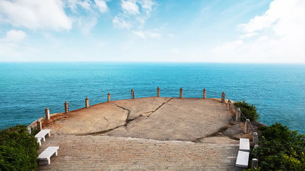 觀日巖位于蜈支洲島的東南懸崖處。站在巖上憑海臨風(fēng),俯瞰全島,遼闊的南海盡收眼底。懸崖下面,怪石嶙峋。 風(fēng)平浪靜之時,乘快艇環(huán)島游,石景千奇百怪,觀日巖像一尊天然大石佛,面向大海,日夜修煉。新世紀的曙光從這里升起,緋紅的太陽從海面上徐徐上升,形成海天一色的海上觀日點。住島客人若欲觀看日出,可向酒店前臺咨詢?nèi)粘鰰r間。