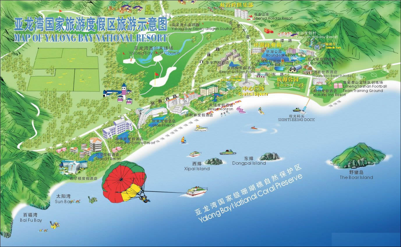 這里三面青山相擁,南面月牙型向大海敞開。除陽光、海水、沙灘俱佳外,尚有奇石、怪灘、田園風光構(gòu)成了各具特色的風景。錦母角、亞龍角激浪拍崖,怪石嶙峋,是攀崖探險活動的良好場所。海面上以野豬島為中心,南有東洲島、西洲島,西有東排、西排,可開展多種水上運動。亞龍灣中心廣場有高達27米的圖騰柱,圍繞圖騰柱是三圈反映中國古代神話傳說和文化的雕塑群。廣場上,四個白色風帆式的尖頂帳篷,給具有古老文化意蘊的廣場增添了現(xiàn)代氣息。