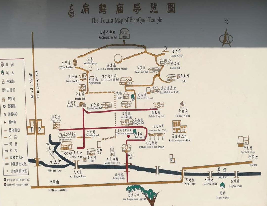 扁鵲廟古建筑群處在群山環(huán)抱之中,廟殿布局嚴謹,木石結(jié)構(gòu),描梁畫棟,奇脊飛檐,紅磚綠瓦。總體呈長方形,按天(玉皇)、地(后土)、人(扁鵲)三才布局,F(xiàn)存有回生橋、山門、扁鵲殿、后土總司殿、玉皇殿、三清殿、老君殿、財神殿百子殿、三霄殿、藥王廟等19座,占地面積15萬平方米,以扁鵲廟為中心形成了龐大的古建筑群,總體布局合理,結(jié)構(gòu)緊湊;是北方典型的道教廟群。其中扁鵲殿、扁鵲墓、透靈碑、回生橋、九龍柏、古代碑廊、三清殿、漢代神獸,為扁鵲廟八大景觀。
