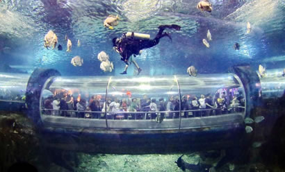 海底世界水族館飼養(yǎng)著來自世界各地的海洋動物200多種,共10,000多艉(頭),其中有大量國家一級、二級珍稀保護(hù)動物,檸檬鯊、豹紋鯊、護(hù)士鯊、海豚、江豚、綠海龜、海獅、海豹、蝠鲼、海狗供游人觀賞。270度環(huán)形的亞克力玻璃圍成的海底隧道全長100米左右,五光十色的珊瑚環(huán)繞在您的周圍,迷人的海底動植物盡收眼底。透過窗口還可以看到一個古羅馬被海水淹沒城市的石像造景。海豚表演館占地面積1萬平方米,建筑面積3,000平方米,總貯水量200萬千克,能同時容納2000多人同時觀看表演,以展示生活在海洋中哺乳動物的海獸表演為主,是一座具有國際標(biāo)準(zhǔn)的海洋動物表演劇場。游客在此可以看到聰明可愛的海豚和滑稽可笑的海獅聯(lián)袂上演精彩紛呈的各項表演:海獅獻(xiàn)上迪斯科、倒立平衡、一獅兩球、套彩圈、單手倒立、頂球過障礙、親吻、水中交誼舞等一系列惟妙惟肖的表演;海豚上演的水中芭蕾舞、踢足球、環(huán)場鞠躬跳躍、伴著樂曲引吭高歌以及充分展示海豚智力的各種表演活動。