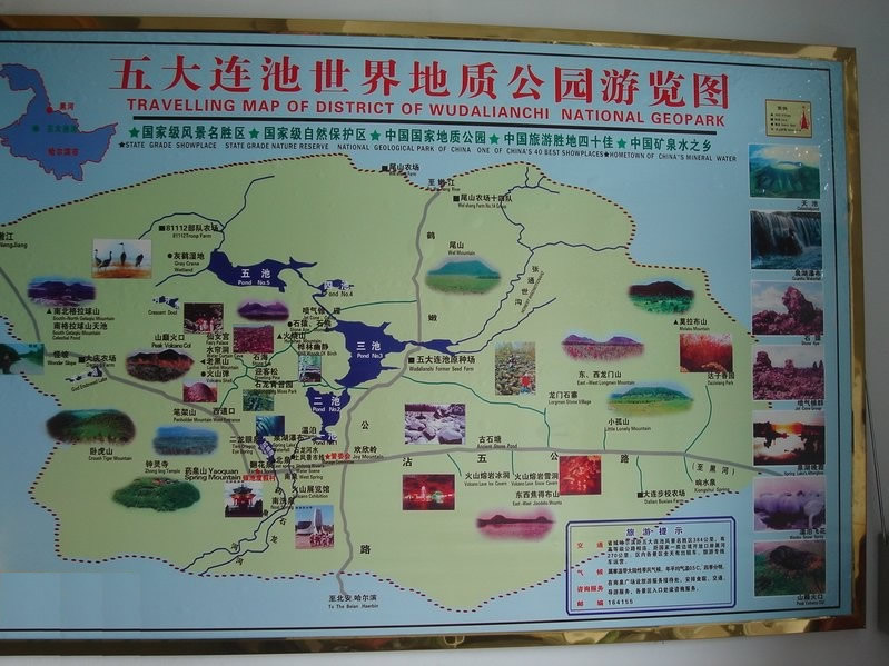 豐水期面積在21.5平方公里,最深處可達36米以上。池底是熔巖和砂底各占一半。開闊的水面倒映著14座火山,景色十分優(yōu)美。三池子的傳說多,景觀也最多,夏季“群山倒影”,冬天“三池冰斷”。湖泊兩岸,一面是壯觀的新期火山熔巖臺地,一面是古火山綠色田園風光。 白龍湖是重要的“地質界湖”,湖區(qū)西岸是新期火山熔巖地貌,東岸是遠古泥沙巖地貌,兩岸穿越億萬年時光隧道,風光各異,可謂是“一湖二景”。白龍湖是民間的“傳奇湖泊”:有湖怪之迷、暗河之迷、冰斷之迷、湖底金沙之迷,有黑龍白龍的傳說、蛤蜊城的故事、連池仙子的神話。