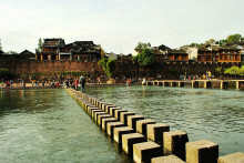 沱江跳巖古城人氣旺盛的風景之一。這是一座古道橋梁,最早建于唐代,是乾州進入當時的五寨司城的必經(jīng)之路。清康熙四十三年(1704年)重修,仍是鳳凰至乾城的古道。跳巖最初由四十多個紅色長方體巖墩子組成,每墩相距二尺,便于鄉(xiāng)民肩挑背馱入城,但每年漲洪水時總有跳巖石墩被沖倒或沖走。民國時期,縣長李宗祺讓在跳巖上架以木板,這比以前行走更為方便,但仍連墩帶跳板被沖走。1950年,鳳凰縣人民政府成立,又重新補缺換新將石墩加大,將兩個墩子聯(lián)成一個,跳巖全長100米,共15個巖墩,上鋪厚實的木板,并以鐵鏈在河底從巖上打眼,用鐵絲系緊,跳巖堅固牢實,保存完好,如今不僅仍是兩岸人民來往的要道,而且成為鳳凰古城頗具民族特色的亮麗風景。2000年秋,為了進一步改善群眾過河的條件,也為了更好地美化裝點古城,鳳凰縣撥款在老跳巖幾十米距離的河下游,新修了一道雙墩跳巖,兩排跳巖相隔一尺左右,一高一低,并排而立,橫跨江上,每排跳巖66墩,一字列于江面,每個石墩之間的距離也就一小步左右,來的走一排,去的走另一排。