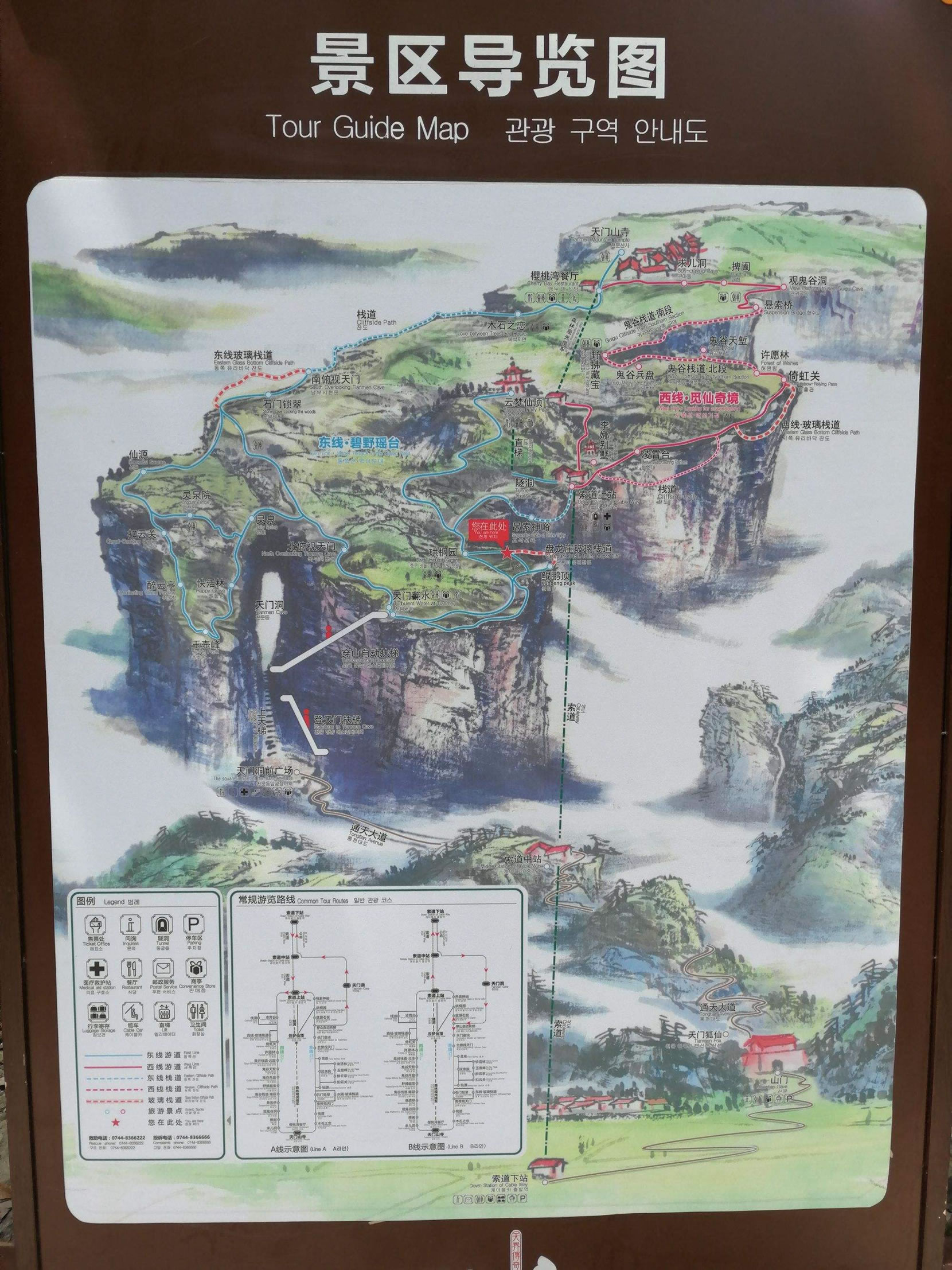 景區(qū)穿山自動扶梯開通的同時,天門山景區(qū)也新開通AB兩條游覽線路:A線游客乘索道上山,游覽山頂后乘穿山電梯到天門洞,游覽天門洞后乘車返回市區(qū)索道下站;B線游客自市區(qū)索道下站乘免費班車至天門洞,乘穿山電梯到山頂,山頂游覽后乘索道返回市區(qū)索道下站。AB兩條游覽路線,同票同價,游客可自愿選擇。 |