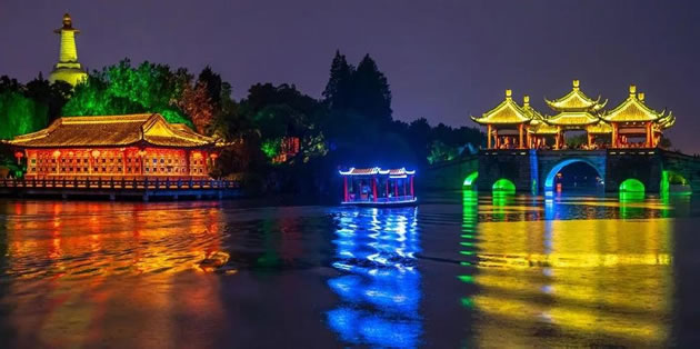 據(jù)介紹,今年瘦西湖“二分明月”夜游活動通過“五大亮點”凸顯夜游沿線亮化脈絡(luò):重新打造的長堤春柳亮化,與荷浦熏風(fēng)遙相呼應(yīng),讓游客遠(yuǎn)眺不一樣的“廣陵紅”;徐園、釣魚臺、鳧莊等經(jīng)典建筑燈光效果再升級,采用氛圍光源,勾勒江南園林“水墨畫”;五亭橋作為瘦西湖的精華、揚州城的名片,橋體及周邊亮化更顯特色,突出獨具魅力“月亮城”;二十四橋在亮化基礎(chǔ)上增加水景表現(xiàn)手法,采用白色燈帶配以冷霧效果,營造如夢似幻“穿越感”;五亭橋旁的1757美食街坊是瘦西湖的網(wǎng)紅打卡地,景區(qū)對其整體亮化進行了提升,還特地打造了小型燈光秀,同時推出網(wǎng)紅“染色燈”“燈光秋千”“感應(yīng)式琴鍵”等互動元素,為市民及游客帶來新奇體驗。