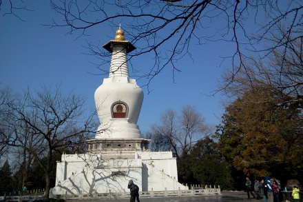 白塔身白色,也稱觀音寺白塔。塔平面呈八角形,由高大的束腰須彌座、八角重檐亭式塔身、碩大的率堵波和頂部的十三天相輪組成。白塔高27.5米 ,下面是束腰須彌塔座,八面四角,每面三龕,龕內(nèi)雕刻著十二生肖像。和北海白塔的厚重穩(wěn)健不同,白塔比例勻稱。