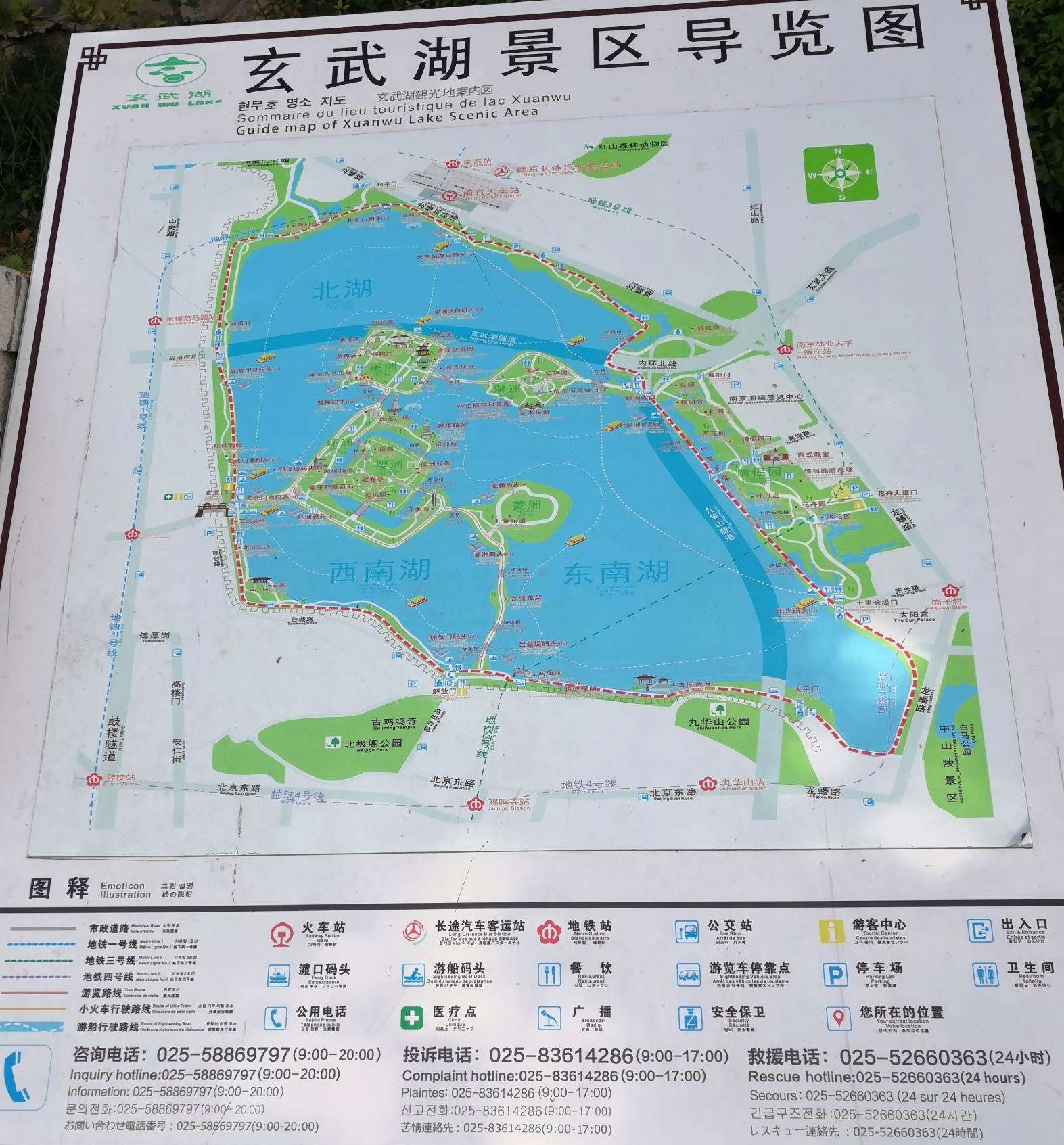 玄武湖環(huán)湖路全長(zhǎng)9.8公里,總面積56萬平方米,周圍分部著眾多的南京著名景點(diǎn),環(huán)湖路西南半邊為南京明城墻圍繞,城墻外便是繁華的都市,靜與鬧僅一墻之隔。北岸自西向東依次為神策門公園、南京火車站,東岸自北向南依次為南京國(guó)際展覽中心、情侶園、白馬公園,南岸自東向西依次為太平門、九華山公園、古閱武臺(tái)、南京武廟、雞鳴寺、解放門、臺(tái)城,西岸自南向北依次為玄圃、玄武門、杉林氧吧、萬三花園,其中西岸和南岸均有南京明城墻為依。