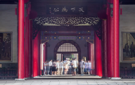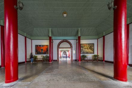 紅柱灰瓦、方磚鋪地的大堂建于太平天國(guó)榮光大殿原址,大堂正中懸掛孫中山手書“天下為公”橫匾。大堂后有東、西廂房各一,其后由封閉的西式通體方格毛玻璃封閉穿堂與二堂相連。穿堂東面是一清代四合院,西面是大禮堂。