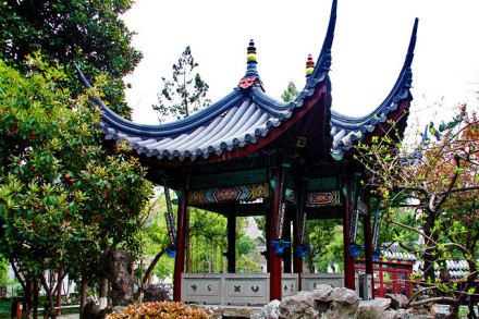 方勝亭,俗稱"鴛鴦亭",是民國(guó)前江南惟一的方勝亭。方勝,又稱雙菱,指兩菱形相疊。亭基方勝,上為雙頂、遠(yuǎn)觀似雙亭并立,近看卻一亭獨(dú)佇,小巧玲瓏,頗為別致。飛檐翹角,如欲飛的鴛鴦。梁柱間有很大的彩繪"雀替木",這是清代建筑的特征之一。因其少用斗拱,為出挑檐,只得加大這種斜角支撐物。亭里可見一些龍鳳獅虎等動(dòng)物形狀的刻繪。