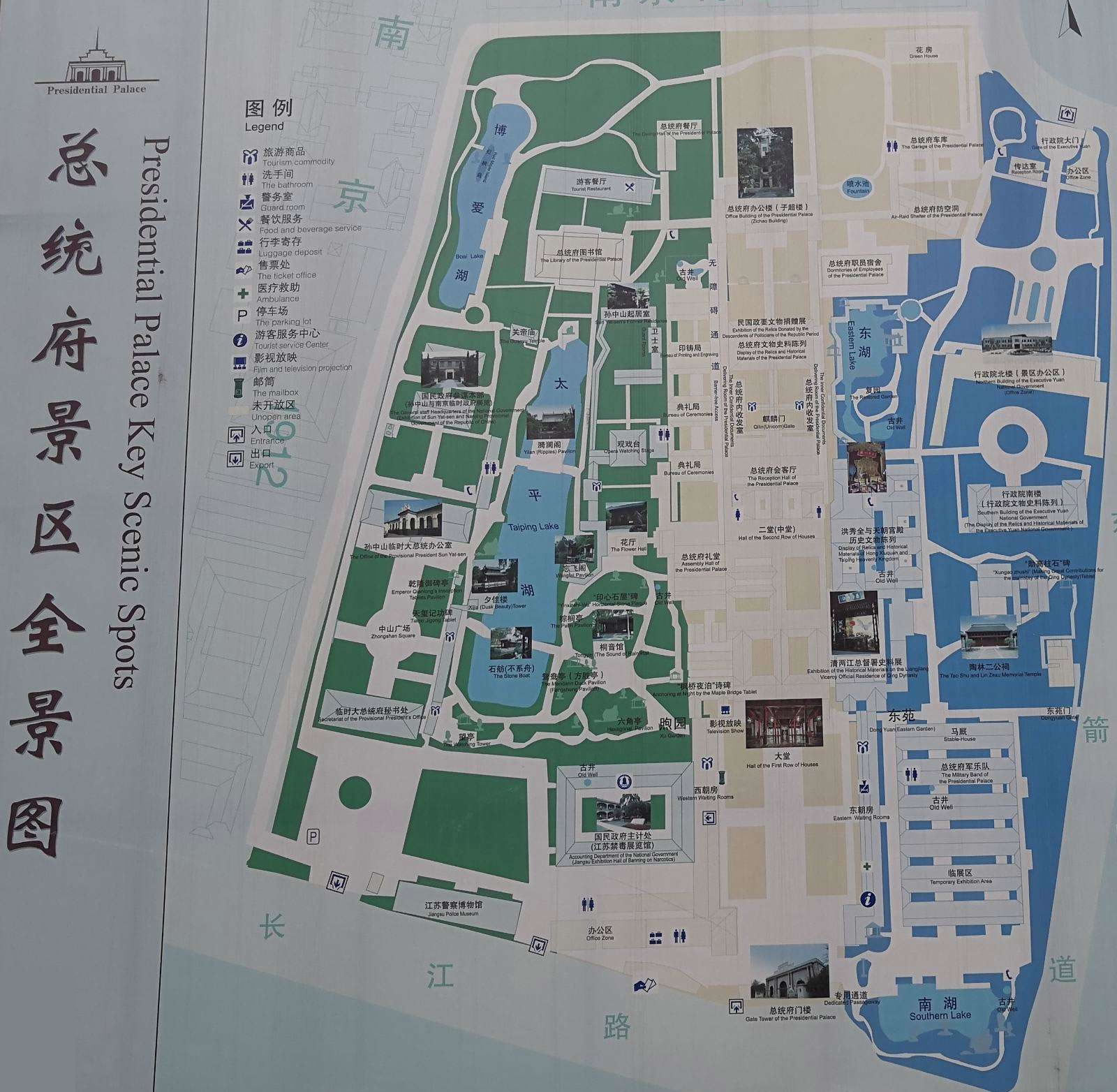 總統(tǒng)府(中國(guó)近代史博物館)占地面積9萬平方米,共分三個(gè)參觀區(qū)域。中區(qū)(中軸線)主要是國(guó)民政府、總統(tǒng)府及所屬機(jī)構(gòu);西區(qū)是孫中山的臨時(shí)大總統(tǒng)辦公室、秘書處和西花園,以及參謀本部等;東區(qū)主要是行政院舊址、馬廄和東花園。一系列展館和史料陳列,則分布在這三個(gè)區(qū)域中。