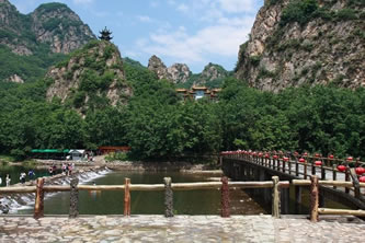 冰峪溝風(fēng)景區(qū)位于莊河市北部山區(qū)仙人洞鎮(zhèn)境內(nèi),距大連市內(nèi)有240公里。景區(qū)規(guī)劃面積約有110平方公里,景區(qū)面積約47平方公里。龍華、攔馬、莢蓉三山屏蔽,英納、小峪兩河盤繞。這里林木參天,山清水秀,宛如江南風(fēng)景,素有“遼南小桂林”之美稱。冰峪溝的風(fēng)景既不同于桂林山水,又不同于黃山云海,以其獨特的風(fēng)格和韻味呈現(xiàn) 在東北遼南的一隅。