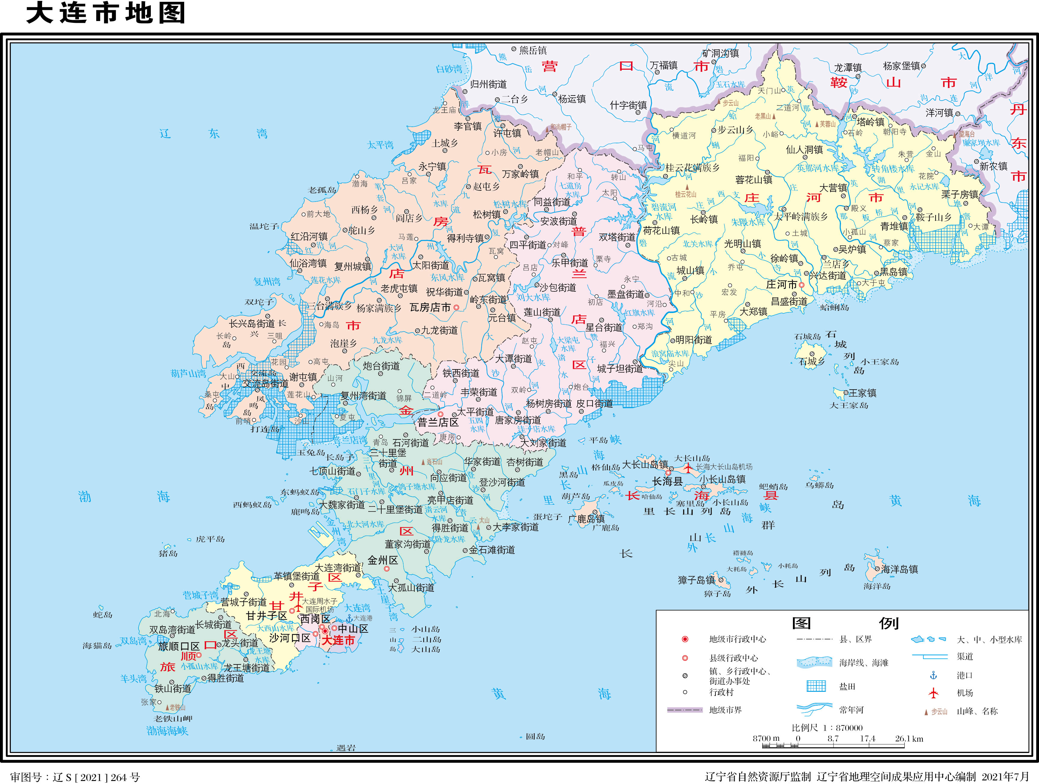 大連市轄7個(gè)區(qū)、1個(gè)縣、代管2個(gè)縣級(jí)市: