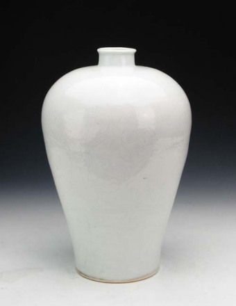 明永樂(lè)白釉暗串枝蓮花梅瓶:小口,圓唇,短頸,豐肩。器物紋飾為劃花,器物肩部上下各兩道弦紋,中間為靈芝纏枝花紋,八顆靈芝首尾相接,纏枝不斷。腹部?jī)山M大荷葉蓮花,每組為三朵蓮花并蒂爭(zhēng)相開(kāi)放,神態(tài)各異。此瓶為明永樂(lè)時(shí)期景德鎮(zhèn)官窯器,甜白釉,白中閃青。釉色白瑩,光亮潤(rùn)澤,胎質(zhì)細(xì)潔,整個(gè)器物造型規(guī)矩。肩部圓潤(rùn)略顯豐滿(mǎn)。底足為平底。