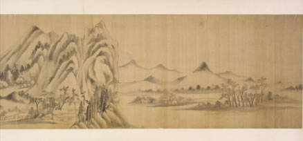 董其昌仿米黃山水圖卷:明晚期,絹本。用筆參以披麻與米點(diǎn)皴法,為其自家面貌。卷后部行書(shū)自題:“家有黃子久《富春大嶺圖》、米元暉《瀟湘圖》,和會(huì)兩家筆意為此卷,大都子久畫(huà)出于巨然與海岳父子同參也!焙笫鹂睿骸岸鬃R(shí)”,下鈐“知制誥日講官”、“董其昌印”白文印二方?顐(cè)鈐“楨父審定”、“墨緣堂來(lái)氏收藏書(shū)畫(huà)記”二印。