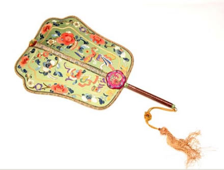 清紅木柄綠緞彩繡博古紋扇:此扇為多弧邊長(zhǎng)方形,扇頂微向后彎曲,扇面為綠色緞制,滿(mǎn)繡五彩花卉、博古紋飾,另有金錢(qián)壓紋邊,扇中骨及邊緣均用彩繡錦邊制成。扇面與柄桿交接處有紅緞五瓣梅花形裝飾,花內(nèi)繡有佛手、瓜、桃及五蝶圖案。扇柄為紅木制成,刻有花卉紋,柄兩頭鑲有綠色骨飾。柄頭系黃色絲穗。