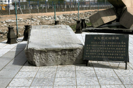 奉天忠靈祠石碑:日本帝國(guó)主義先后在沈陽建立了“日俄奉天大會(huì)戰(zhàn)紀(jì)念碑”和“靖國(guó)神社奉天分社忠靈祠、忠靈塔、忠靈碑”,用來埋葬侵華日軍在日俄戰(zhàn)爭(zhēng)至“九·一八”事變期間戰(zhàn)死者的36400多個(gè)將士的遺骨。