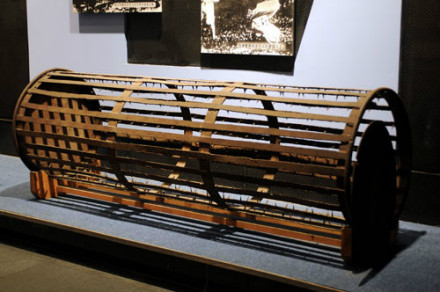 滾地籠刑具:這件黑色的鐵制滾地籠刑具,就是日偽時(shí)期被用于迫害抗日反滿志士及廣大無辜群眾的刑具。它縱66厘米,橫200厘米,呈圓柱形,中空,籠內(nèi)壁鑲滿鋒利的釘刺,釘尖向內(nèi),側(cè)面為鐵皮蓋,可打開。 該刑具原存于沈陽階級(jí)教育展覽館,后由遼寧近現(xiàn)代歷史博物館收藏,1998年,調(diào)撥給“九·一八”事變紀(jì)念館擴(kuò)建辦,1999年9月18日轉(zhuǎn)入“九·一八”歷史博物館收藏。