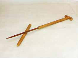 拐杖刀:俗稱“二人奪”,長(zhǎng)約90厘米。表面上看呈拐杖型,木質(zhì)。但實(shí)際上,其前面是可以斷開的,拔出外鞘,里面是一個(gè)刺刀。這是抗日斗爭(zhēng)初期,東滿游擊隊(duì)和當(dāng)?shù)厝罕娪脕韺?duì)付敵人的秘密武器。是當(dāng)時(shí)很流行很實(shí)用的武器。