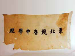 東北競(jìng)存中學(xué)校旗:這面校旗,雖然多處損破,但這面旗幟是人民宣傳和進(jìn)行抗日救亡活動(dòng)的光輝旗幟。