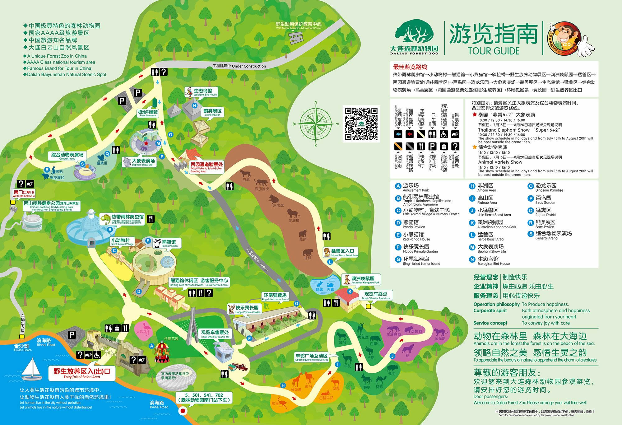 大連森林動(dòng)物園在動(dòng)物品種上主要突出新、奇、特;在動(dòng)物種群上主要突出少而精;在展養(yǎng)方式上以圈養(yǎng)和散養(yǎng)為主,突出熱門主題展示、注重"全天候"及人與動(dòng)物的交流;在環(huán)境處理上以自然風(fēng)光為主,形成自然景觀與人文景觀有機(jī)結(jié)合。