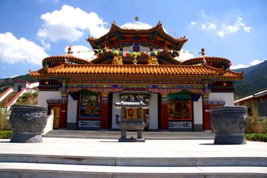 廣宗寺,其整個(gè)建筑氣勢(shì)宏偉,富麗堂皇。主要建筑有大雄寶殿、大經(jīng)堂、黃樓寺等。其中供奉西藏第六世達(dá)賴?yán)镞z體寶塔的大殿稱為“黃樓寺”。黃樓寺是一座兩層樓閣的建筑,其前部為81間,后部為49間,全部用黃、綠色琉璃瓦砌成,極為富麗。