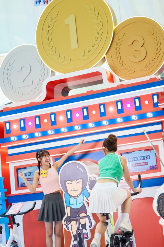 寓意慶祝勝利的凱旋門上方豎立著所有運動員都渴望于這國際體壇舞臺贏取的金銀銅牌,寄托了對我國運動員的美好祝福,游客更可參與單車互動競技游戲,踏上單車裝置與現(xiàn)場“小女車神”齊齊破風(fēng),以最快速度完成200米計時賽競逐“車神”寶座。