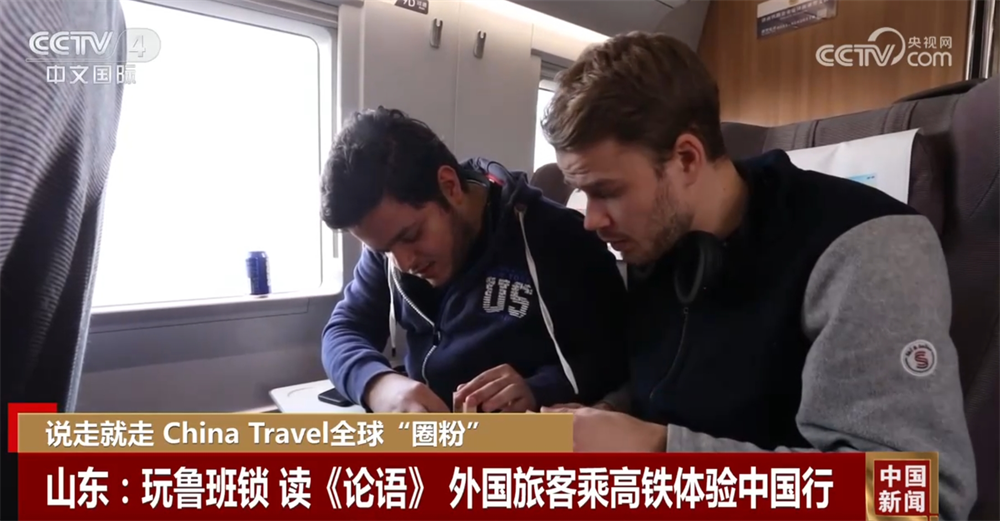 隨著過(guò)境免簽外國(guó)人在境停留時(shí)間延長(zhǎng)為240小時(shí)等政策的實(shí)施,便捷的中國(guó)高鐵也成為了越來(lái)越多外國(guó)游客游覽中國(guó)的一種選擇。在青島開(kāi)往濟(jì)南東方向的G6910次列車上,來(lái)自挪威的旅客哈蘭正興趣盎然地和來(lái)自埃及、同樣喜歡中國(guó)傳統(tǒng)建筑榫卯結(jié)構(gòu)的同伴易卜拉欣一起研究魯班鎖的玩法。